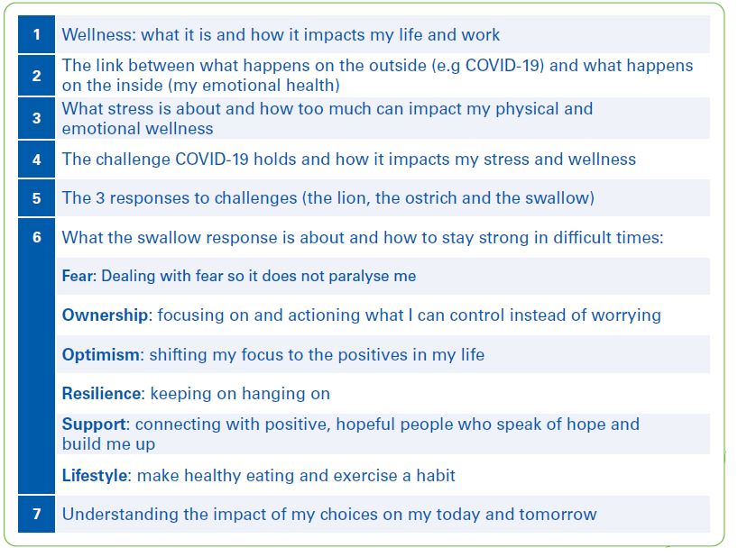 Organisations have an opportunity to support their people and influence their motivation, sense of engagement and productivity positively by complementing the focus on physical wellness that most COVID-19 education campaigns have had up to now with investing in employee mental health and emotional wellbeing. Realising that organisations need toolkits to be able to do this well, Free To Grow has developed “Staying Strong”, a workshop which focuses on strengthening one’s resilience, optimism and ownership – a mindset that will impact employees’ work and lives positively far beyond the fear caused by COVID-19. Inter alia, the content of this workshop (which can be presented “face-to-face” physically or virtually, or via a DIY toolkit, with 16 high-impact short videos and related visual guidelines) includes the following: